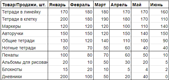 Мы не случайно выбрали для примера канцелярку. Спрос на этот товар зависит от сезона — продажи активизируются в августе в преддверии учебного года. А с началом летних каникул в июне — спад.