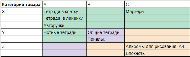Для примера возьмем тот же условный магазин канцтоваров, по ассортименту которого ранее делали АВС-анализ.