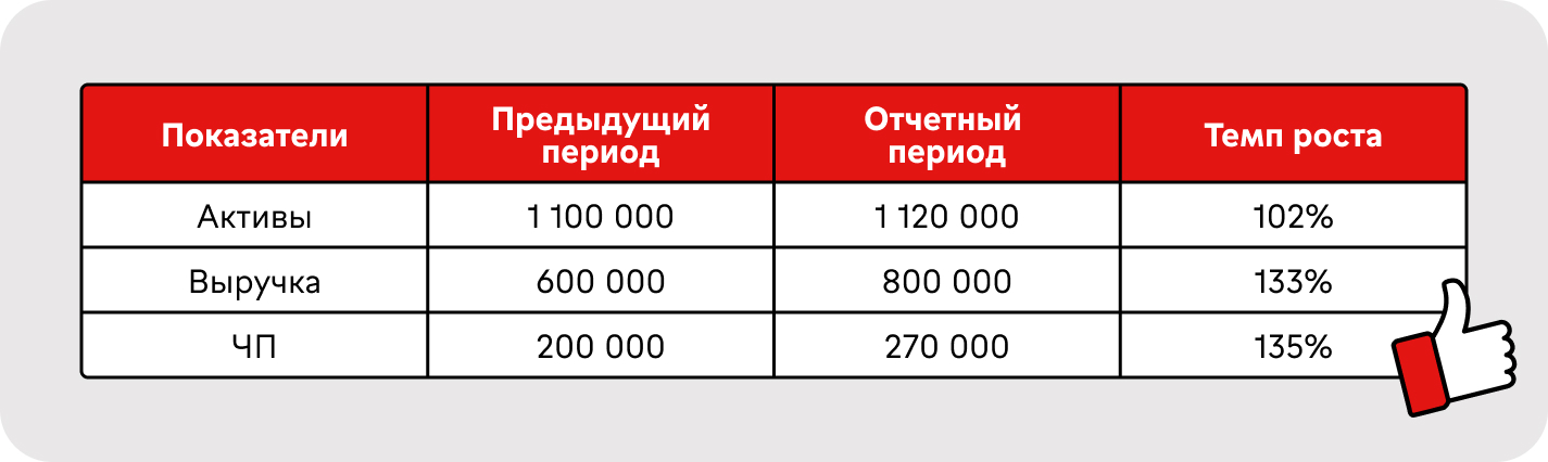 При анализе этих показателей важно учитывать соотношение между ними. В идеале темп роста прибыли должен быть выше или хотя бы равным темпу роста выручки и активов. Если это так, то бизнес использует свои ресурсы эффективно, а его рост сбалансирован. Рассмотрим на примере ↓↓↓