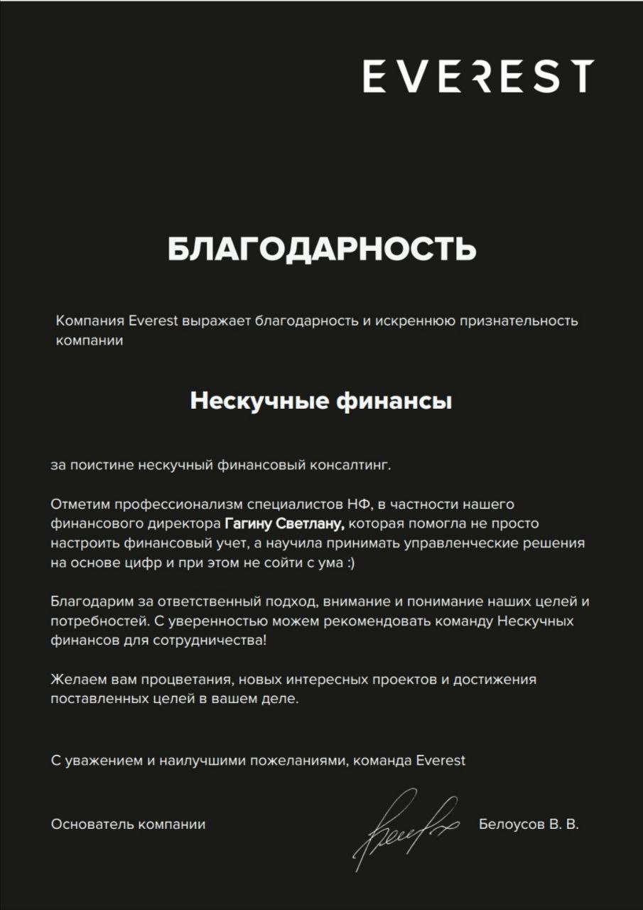 - Компания Everest выражает благодарность и искреннюю признательность компании НЕСКУЧНЫЕ ФИНАНСЫ за поистине нескучный финансовый консалтинг