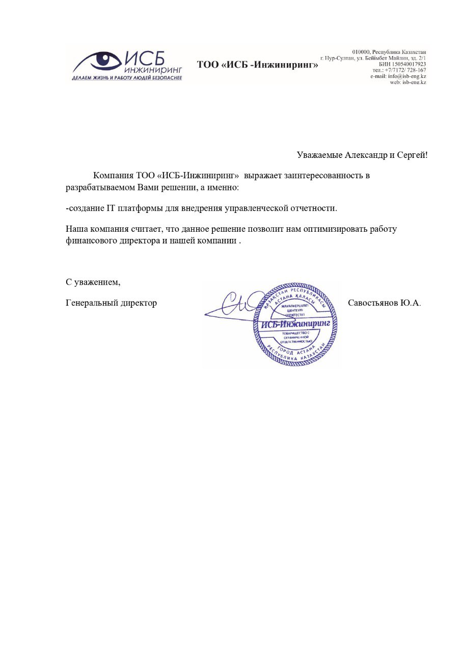 - Компания ТОО "ИСБ-Инжиниринг" выражает заинтересованность в разрабатываем вами решении, а именно: создание IT платформы для внедрения управленческой отчетности.