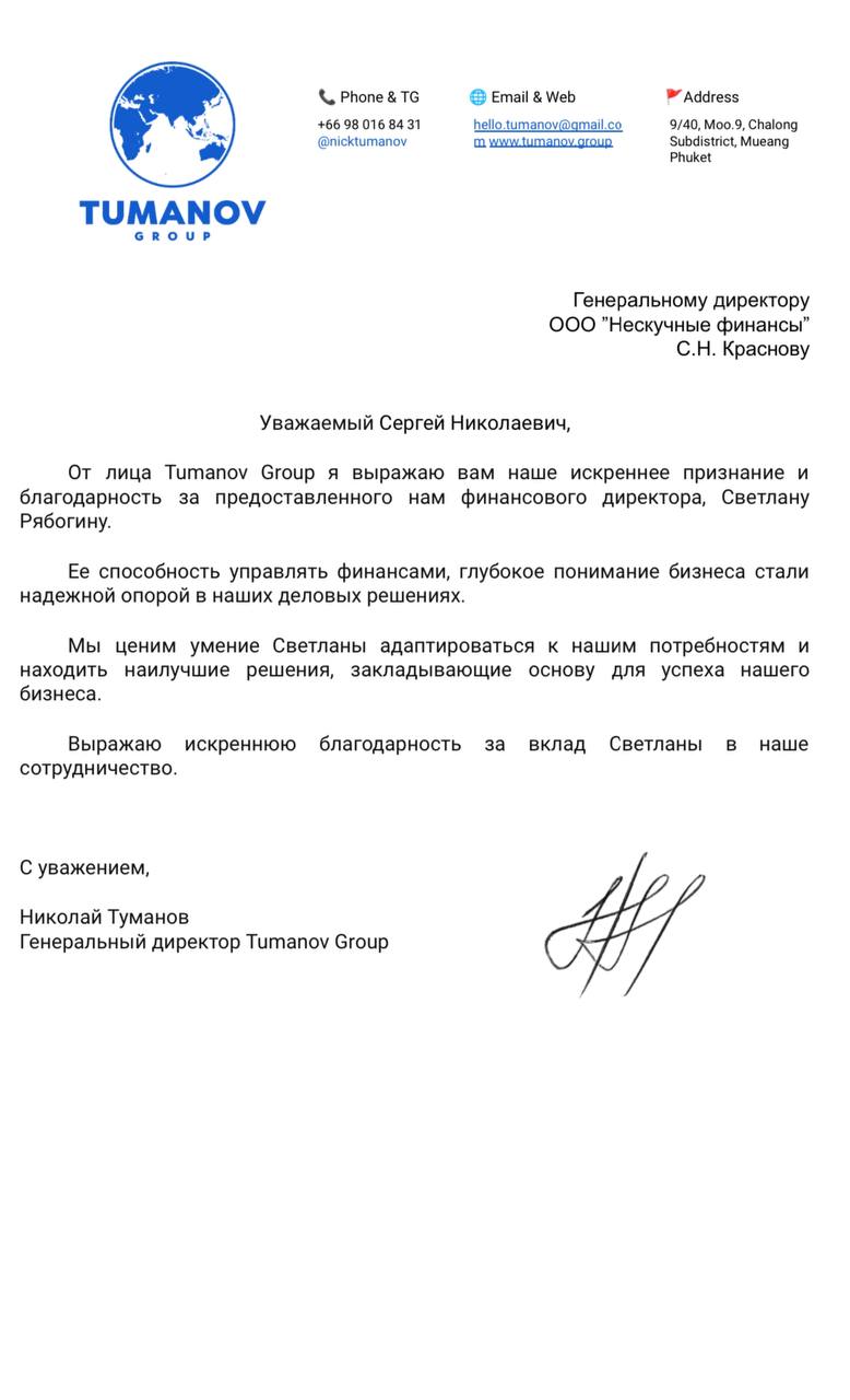 - От лица Tumanov Group я выражаю вам наше искреннее признание и благодарность за предоставленного нам финансового директора