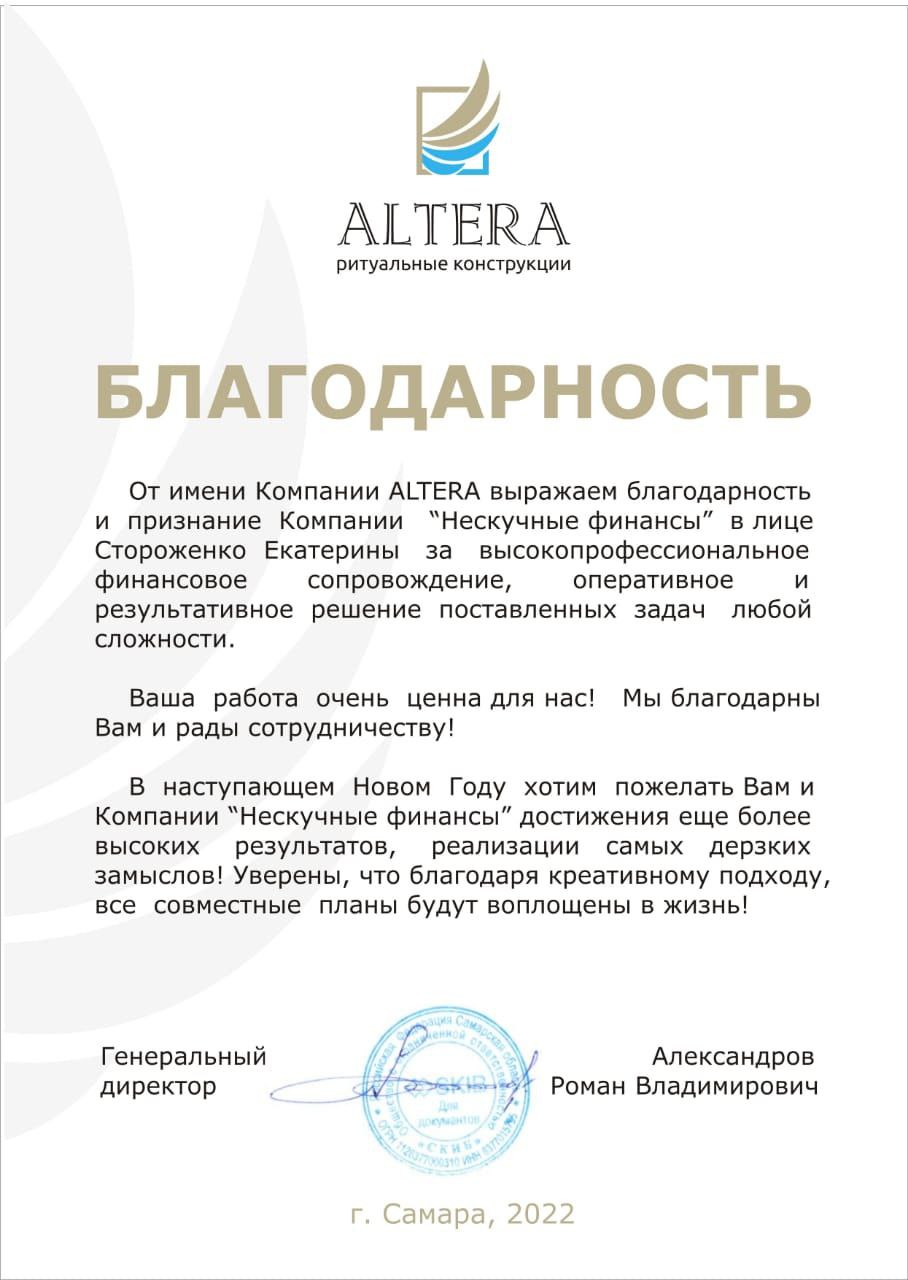 - От имени Компании ALTERA выражаем благодарность и признание Компании "Нескучные Финансы" в лице Стороженко Екатерины за высокопрофессиональное финансовое сопровождение, оперативное и результативное решение поставленных задач любой сложности